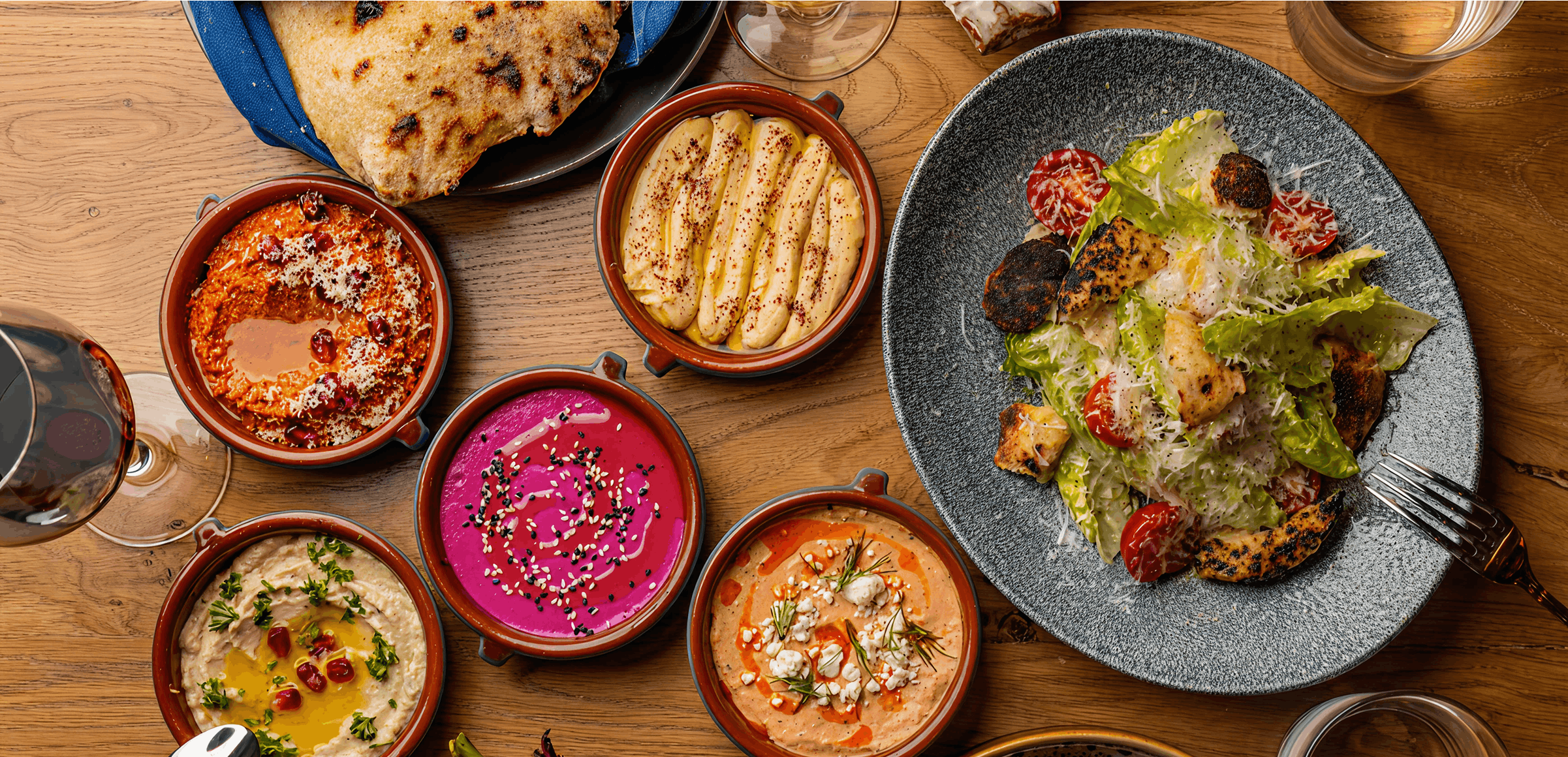 Celebrate and share flame-roasted ingredients and bold Mediterranean flavors, paired with freshly baked pita.